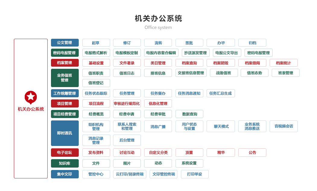 包含通知公告、部隊要訊、公文辦理、值班交班、工作計劃、文化共享、即使通訊、文件打印功能模塊。
