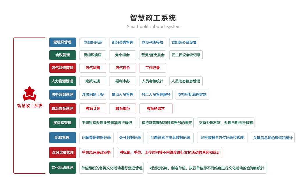 包含控制臺、組織架構、黨建動態、黨員學習、組織活動、志愿服務、黨費管理、監督執紀功能模塊。通過黨建在線學習教育,解決黨建學習難問題,實現便捷化管理;黨務工作流程及黨建資訊全掌握、黨建工作全方位可視,統一數據標準,智能分析績效考評,成績一目了然,做到數據指標化;積極推進黨建工作高效完成,信息高效處理。
